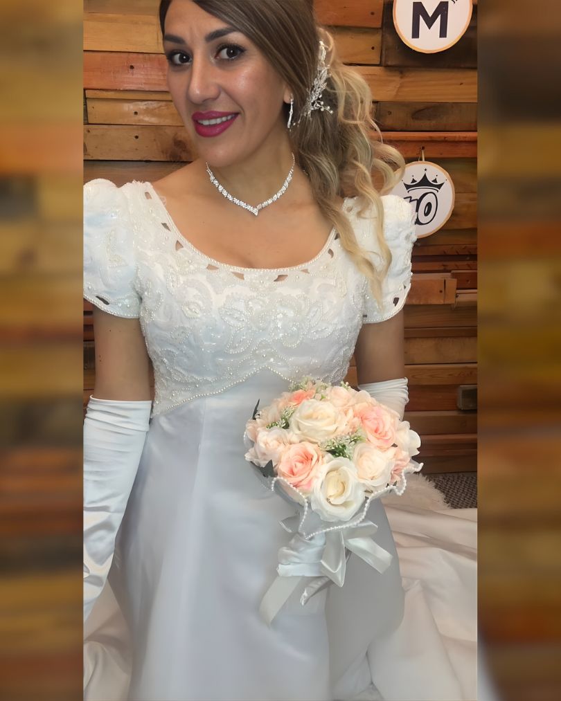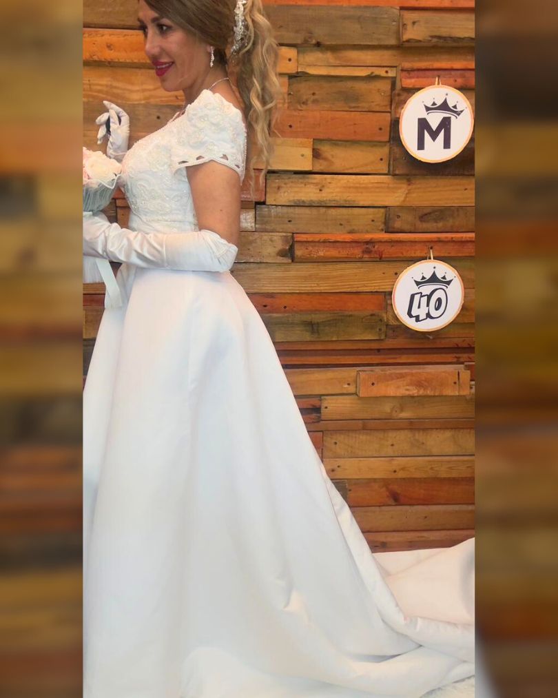 Silueta: Majestuosa silueta de corte A o princesa, con una falda completa y estructurada de satén.