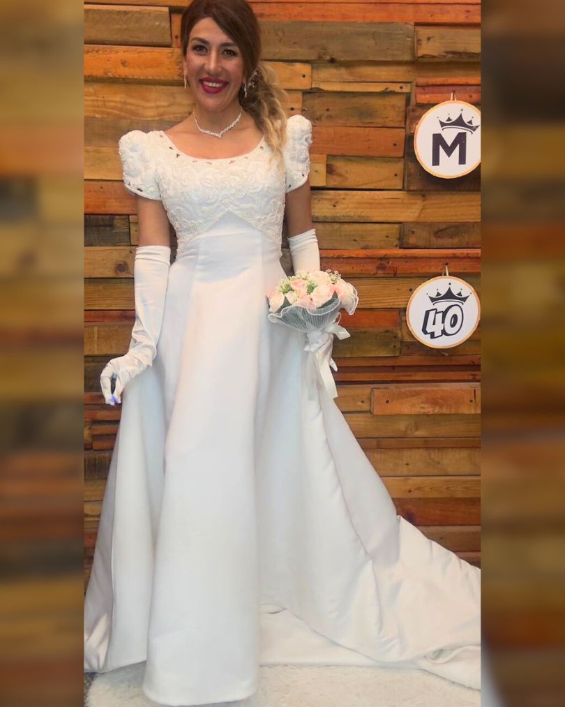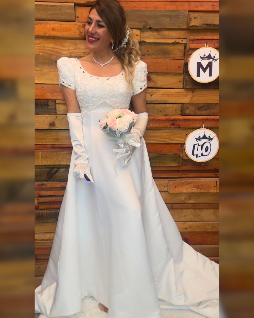 Look Vintage: Dramático y formal con mangas cortas abullonadas y un escote redondo calado, adornado con más pedrería.