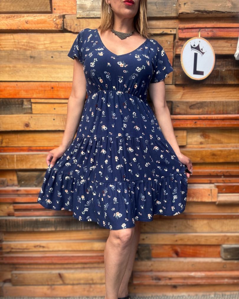 Vestido azul marino con print floral diminuto. La falda de volantes y la cintura elástica crean un look bohemio, fresco y cómodo.